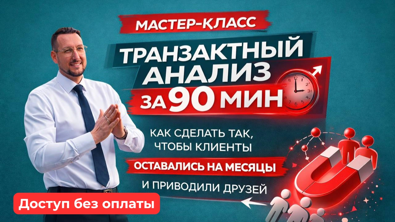Мастер-класс: ТРАНЗАКТНЫЙ АНАЛИЗ за 90 мин - практический онлайн-мастер-класс по Транзактному Анализу, где за 90 минут вы познакомитесь с одним из самых признанных методов психологии, научитесь видеть жизненные сценарии людей, разбирать сложные запросы клиентов и получите инструменты, которые сможете сразу применять в консультациях.