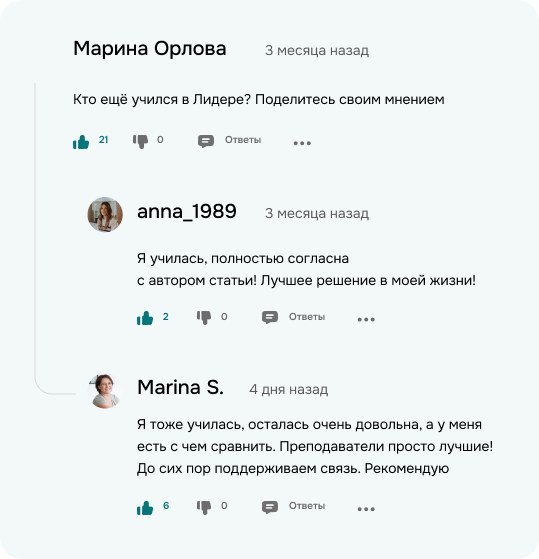 Это преподаватели, которые всегда рядом. Даже после обучения мы остаёмся на связи, в чате, с поддержкой и обратной связью.